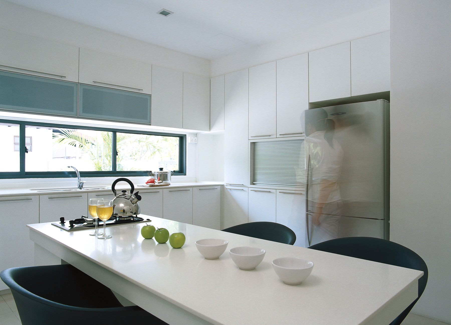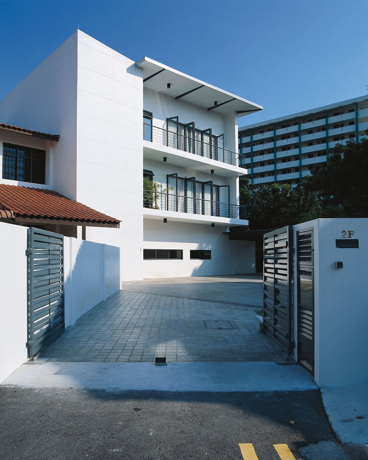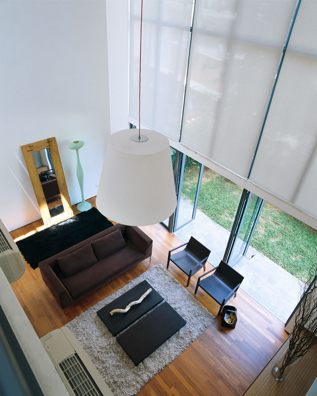Modern but not cold, a double volume living area was created with an equally impressive skylight over the lenght of the entire 3 story staircase. Catering to the family members' different tastes, an interior design scheme neutral enough for anything was created. Each floor of the 3 storey semi-detached house is self-contained so that the different family units can have privacy.