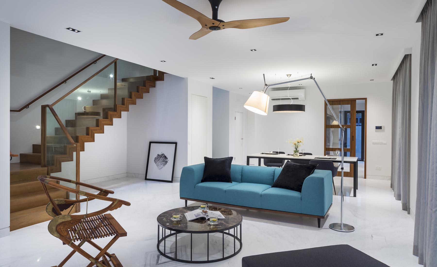 Entering the home, sunlight from the various skylights and air wells filter gently into the ground floor living space, bringing in the warmth of the tropical sun but also allowing the heat to dissipate. With the various elements of climate responsiveness that aim to maximize light and reduce heat, the house is a screenshot of the tropics, an exemplar illustration of the warmth and passive nature of tropical living.