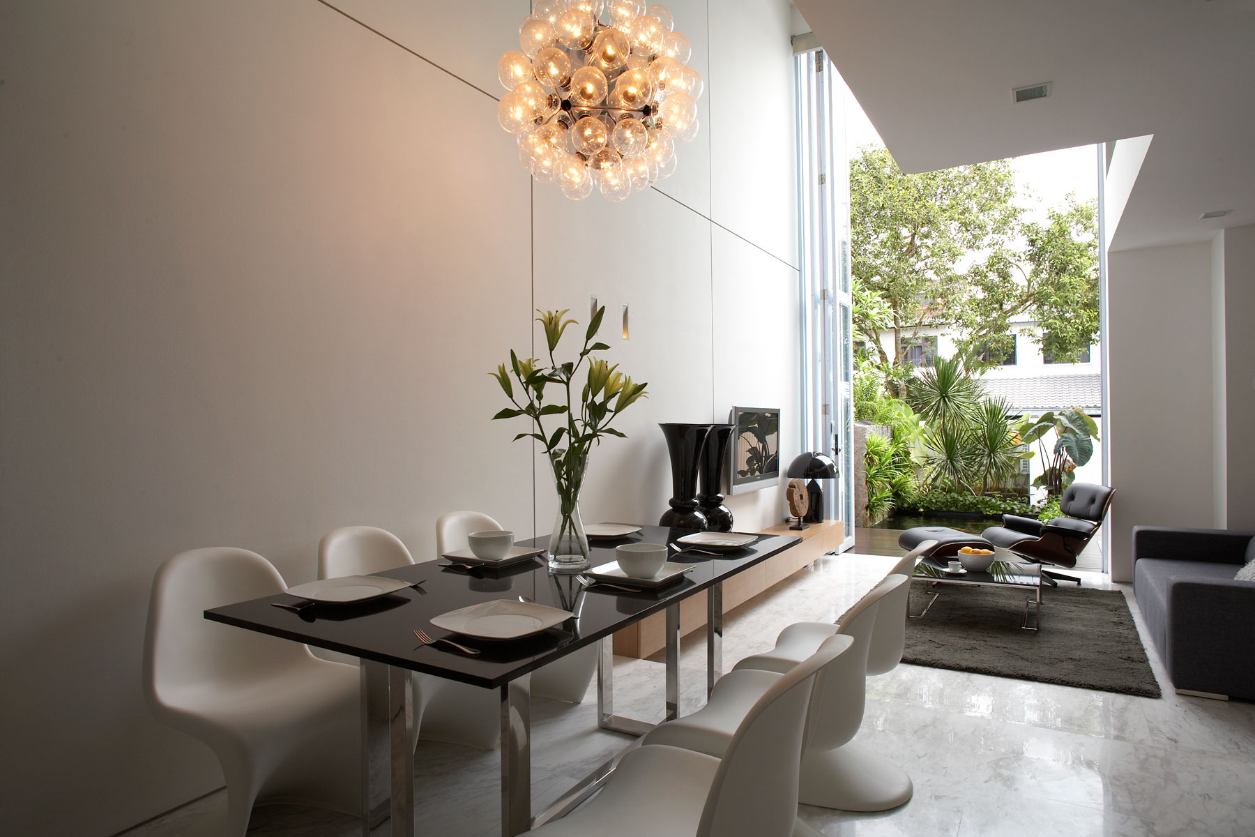 A set of tall folding doors cut into the facade and facing the garden. Measuring 6.5m in height, they accentuate the double volume interior space of the living and dining room. At the same time, when open, the doors help to blur the boundary between the inside and outside.